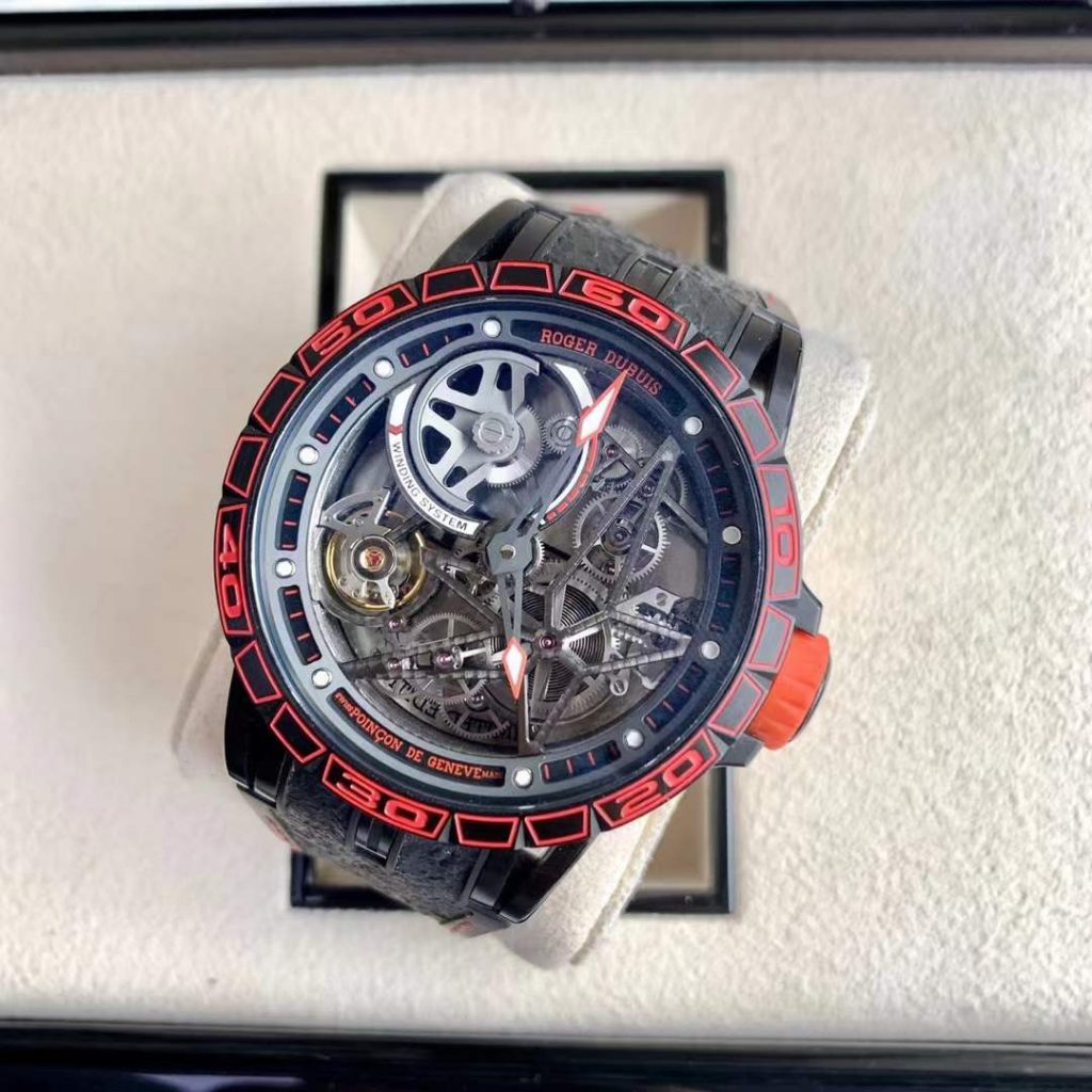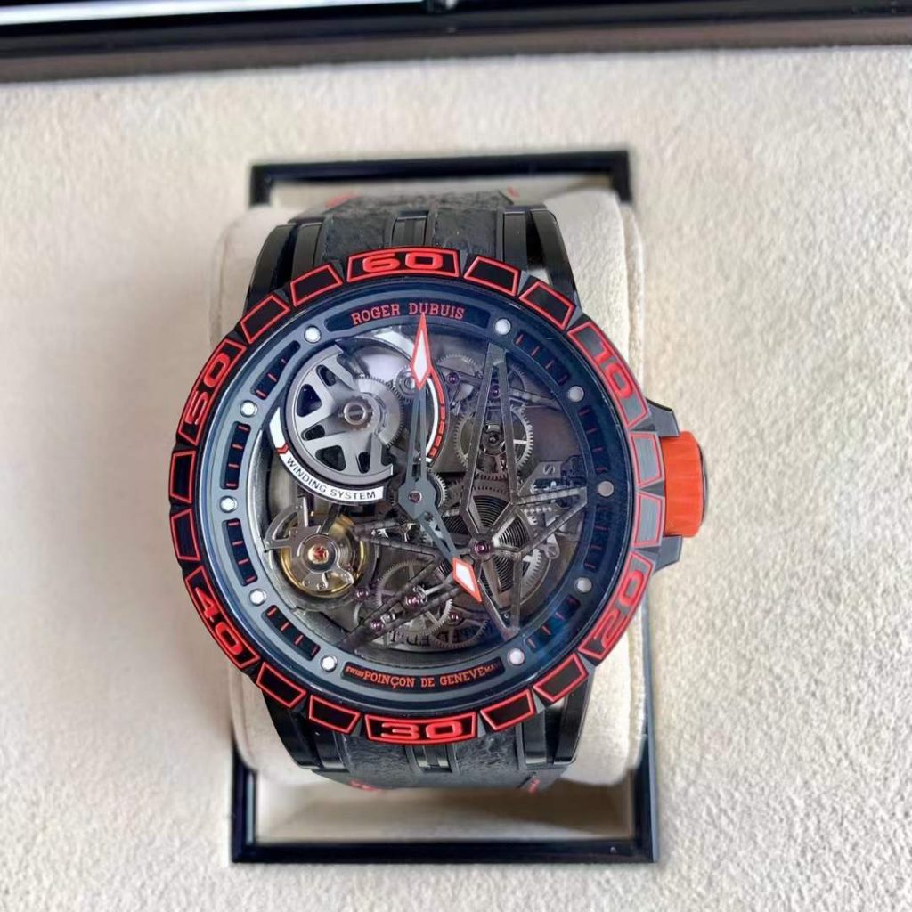 罗杰杜彼王者系列 RDDBEX0695,倍耐力限量,全球仅88枚,王者之剑,全镂空表盘,黑红配色,黑色DCL涂层钛合金材质,表径45mm,前置摆陀,透底自动机械,专柜售价62.2万,极品成色,现货漏价19.6万。